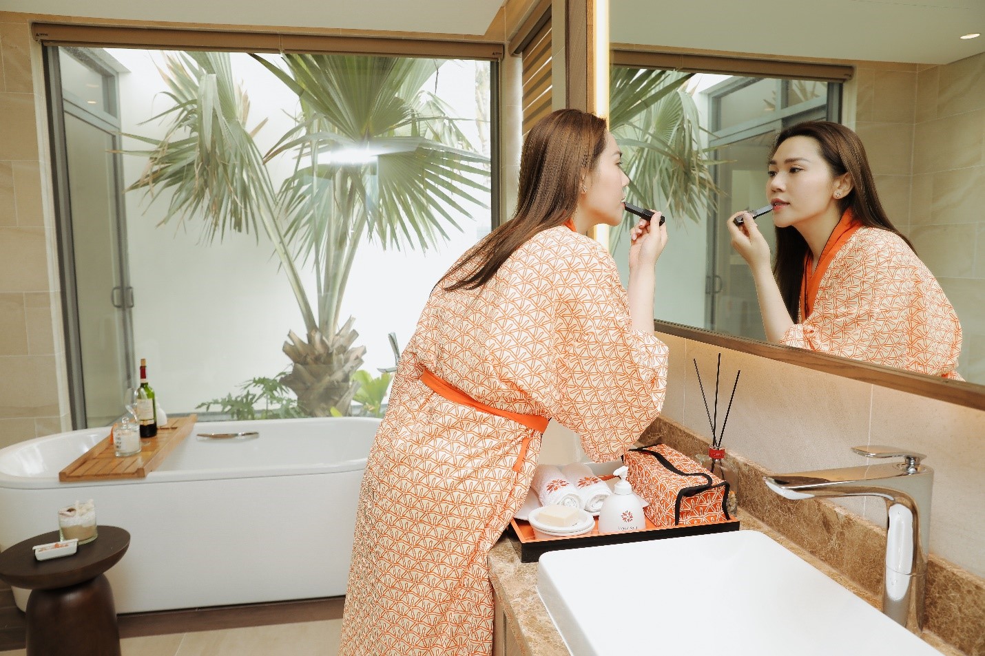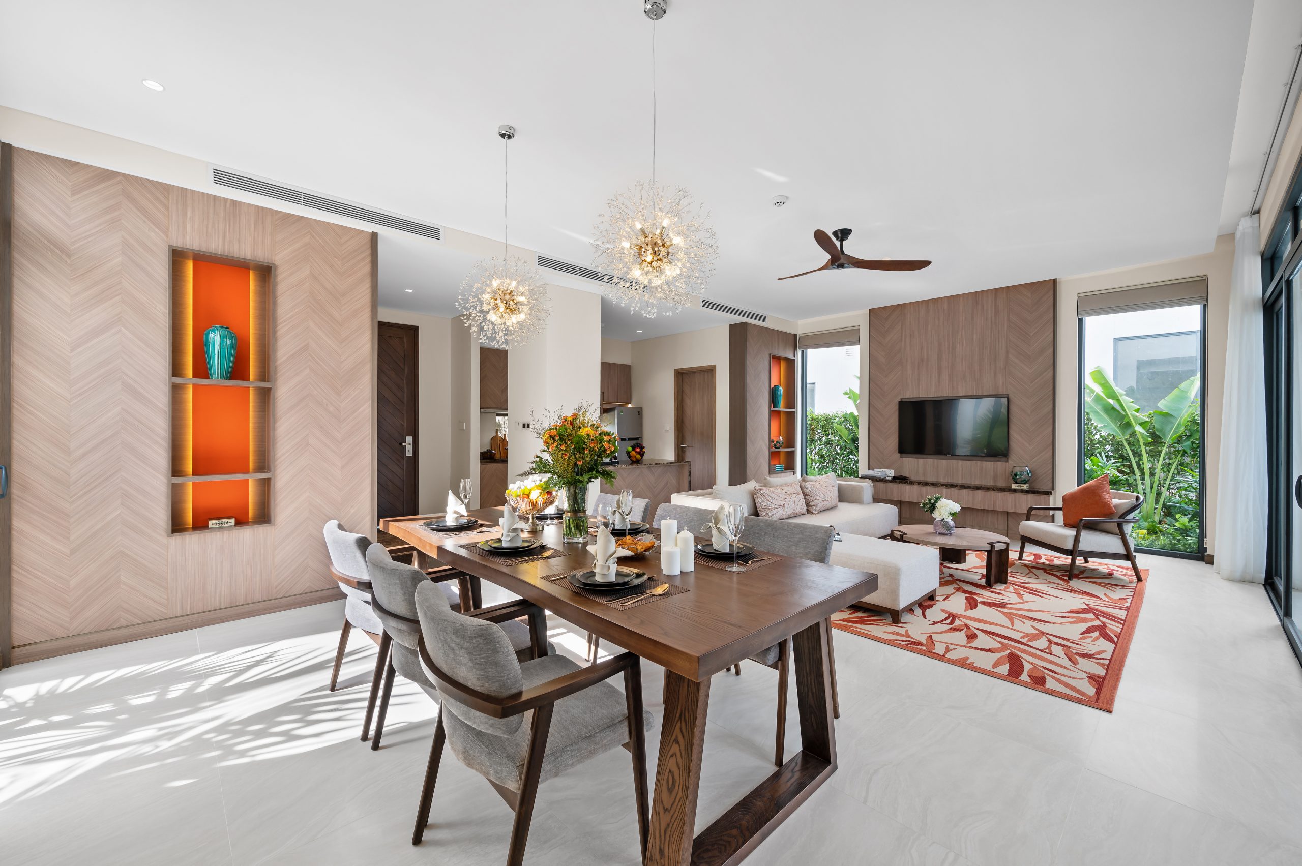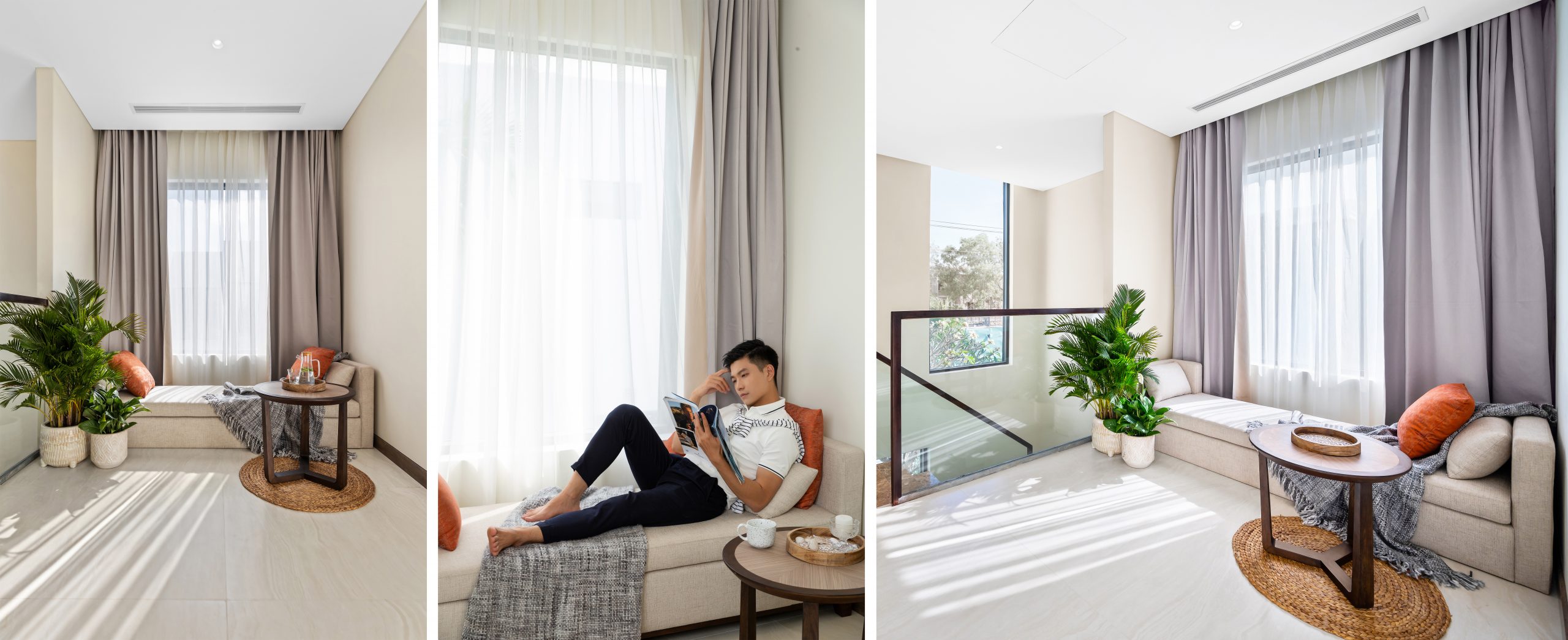 Bringing sketchy line imbued with local identity into the design, Angsana Residences Ho Tram is adorned with delicate stylized motifs inspired by Melaleuca tree. In addition, the use of a warm color palette, with sketchy line that is vibrant orange tone creates a highlight, contributing to creating a pristine energy flow throughout the space inside the villa. Contemporary design language emerges impressively, both trendy and carrying timeless beauty.